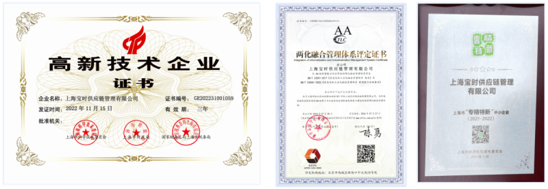 這些系統(tǒng)的研發(fā)和應(yīng)用,不僅提升了寶時(shí)云倉的倉儲(chǔ)和配送效率,更為其打造服務(wù)復(fù)雜供應(yīng)鏈的智慧云倉提供了堅(jiān)實(shí)的基礎(chǔ)。專業(yè)的服務(wù)得到行業(yè)與客戶高度認(rèn)可,寶時(shí)云倉先后榮獲上海市高新技術(shù)企業(yè)、上海市專精特新企業(yè)、兩化融合管理體系A(chǔ)A級(jí)評(píng)定證書。