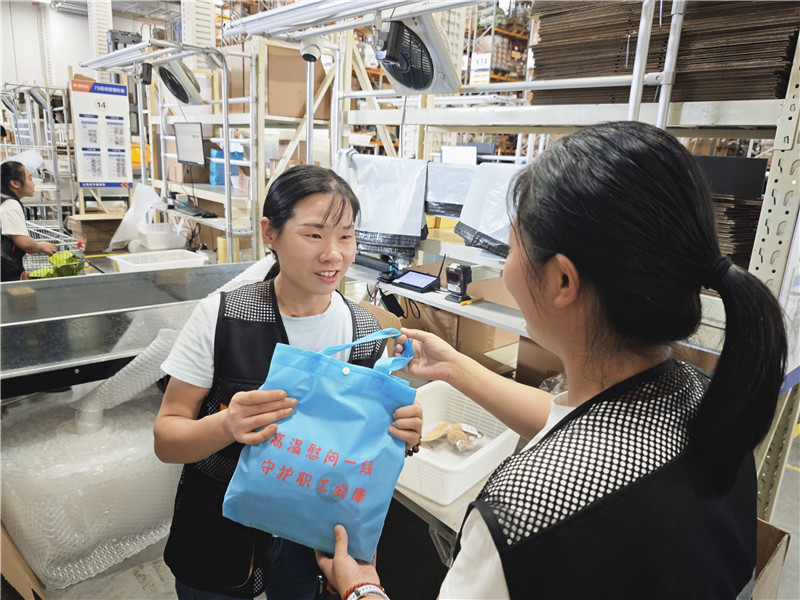 "天氣熱,大家一定要注意防暑,"陳文娣一邊發(fā)放物資,一邊叮囑員工注意身體。